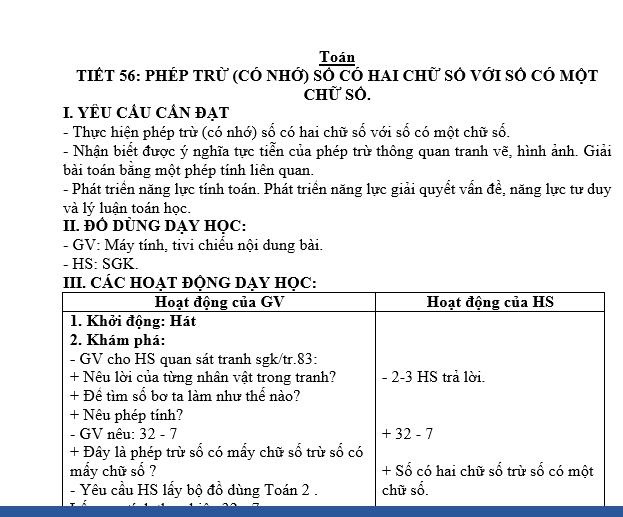Toán 2 TIẾT 56: PHÉP TRỪ (CÓ NHỚ) SỐ CÓ HAI CHỮ SỐ VỚI SỐ CÓ MỘT CHỮ SỐ.