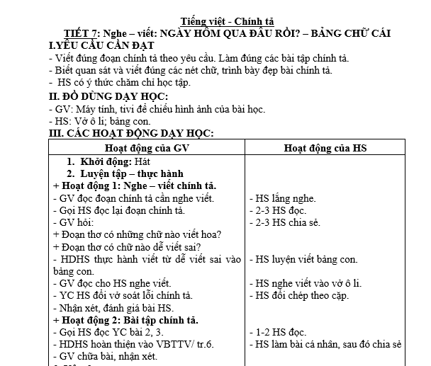 LỚP 2 TIẾT 7: Nghe – viết: NGÀY HÔM QUA ĐÂU RỒI? – BẢNG CHỮ CÁI