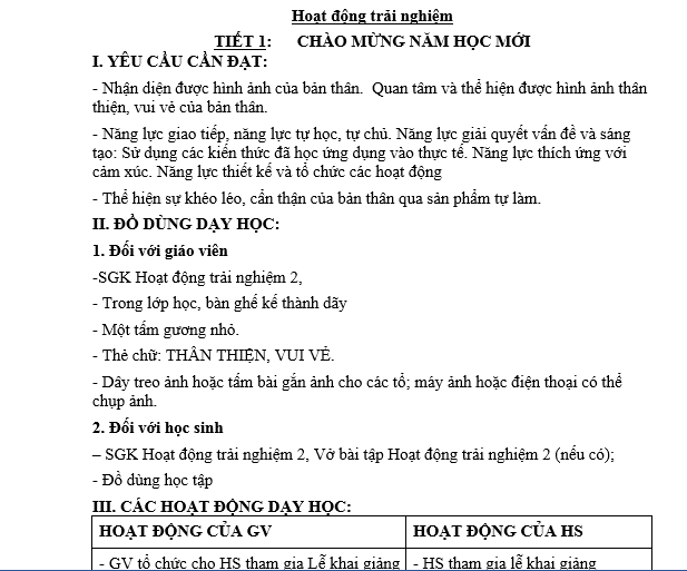 LỚP 2 Hoạt động trải nghiệm TIẾT 1: CHÀO MỪNG NĂM HỌC MỚI