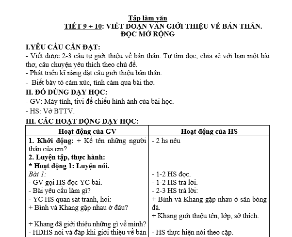 LỚP 2 TIẾT 9 + 10: VIẾT ĐOẠN VĂN GIỚI THIỆU VỀ BẢN THÂN. ĐỌC MỞ RỘNG