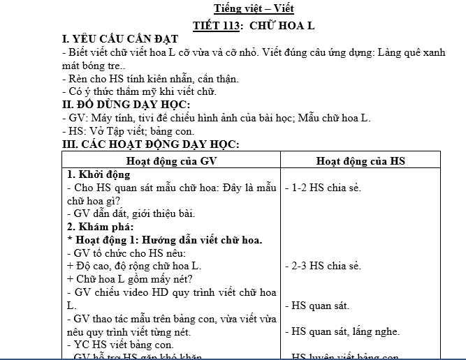 Tiếng việt lớp 2 Viết TIẾT 113: CHỮ HOA L